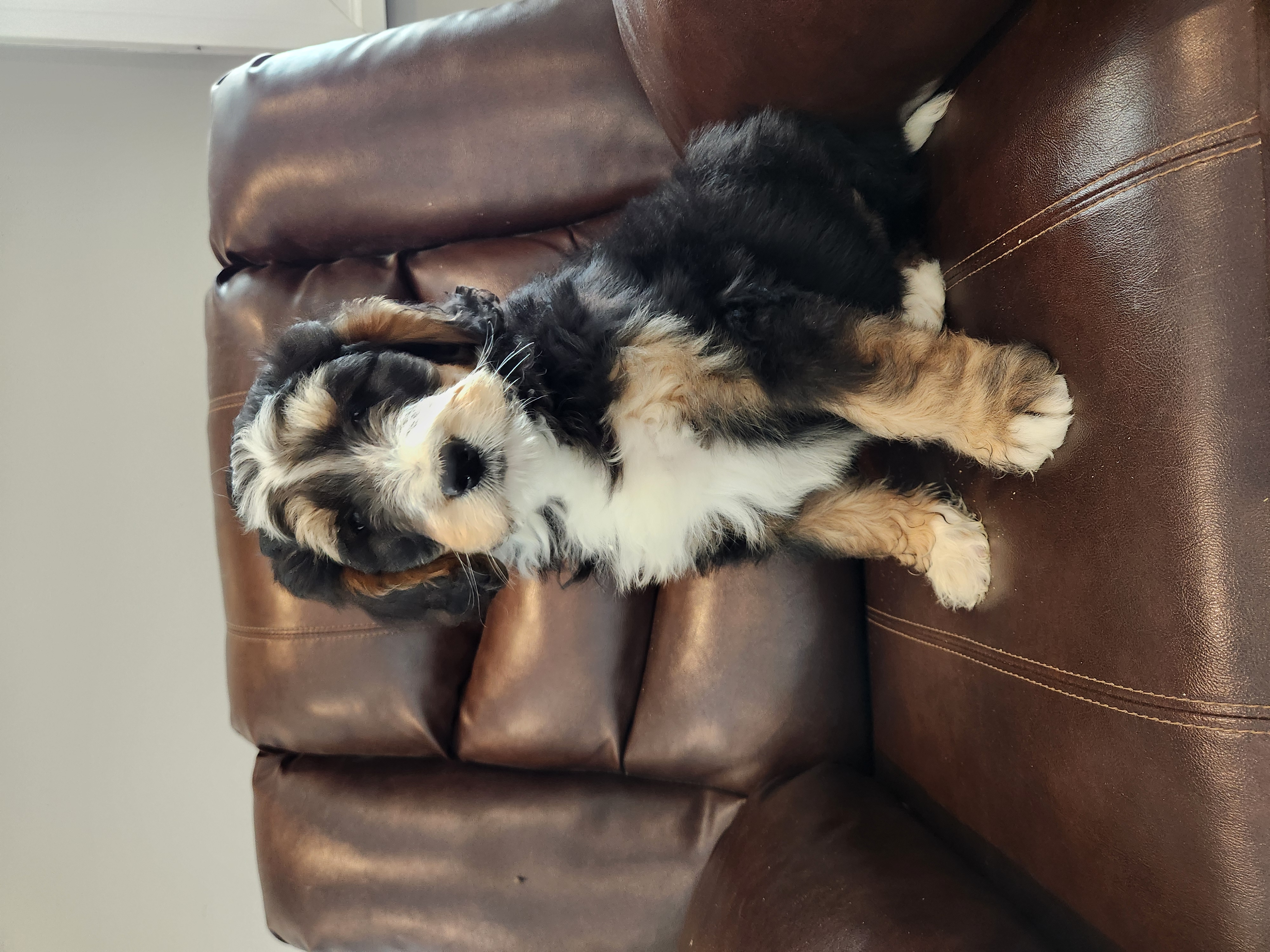 #1 Mary/Tahiti - Very pretty Bernedoodle male, he has full white and nice dark tan points! $2000
