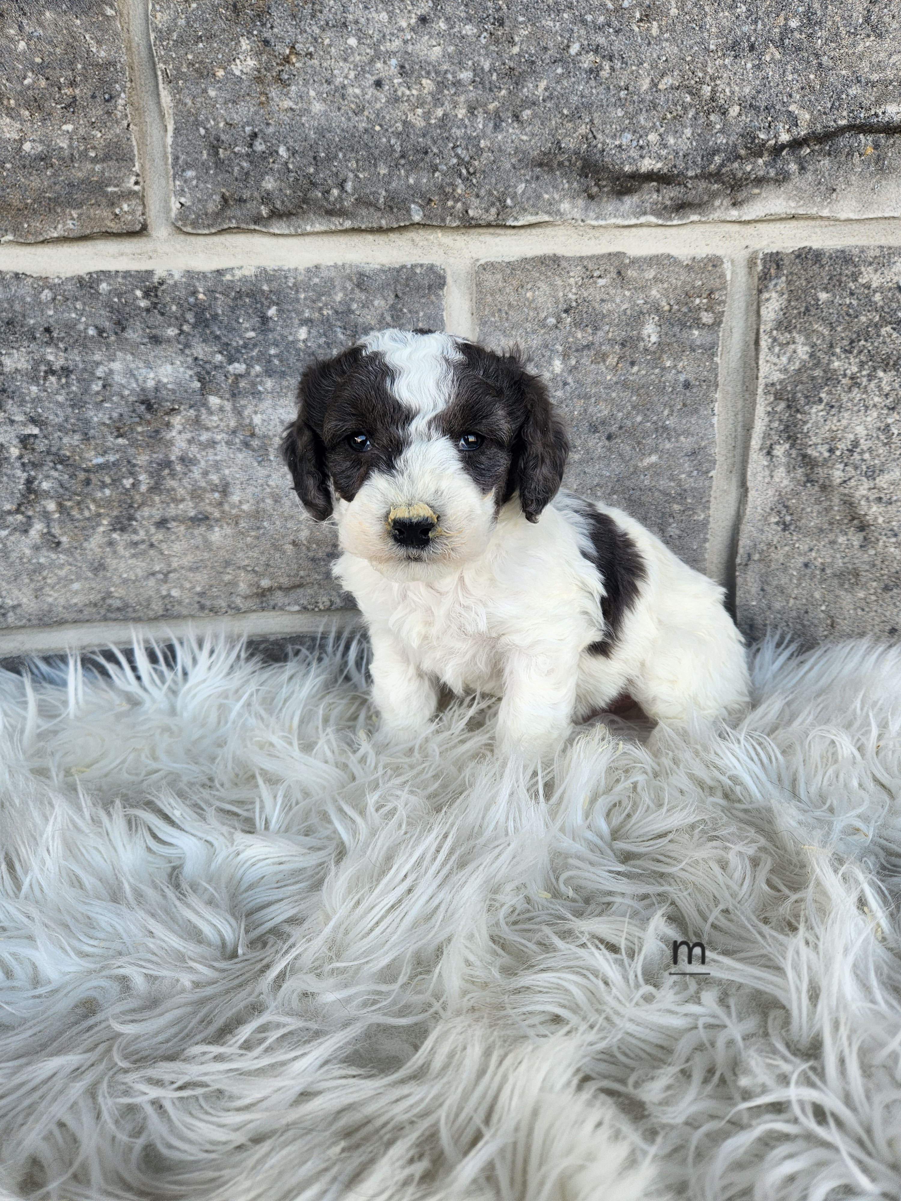 #15 Janae and Gigola - F1B Bernedoodle male, parti colored coat with nice curls coming in! $2500