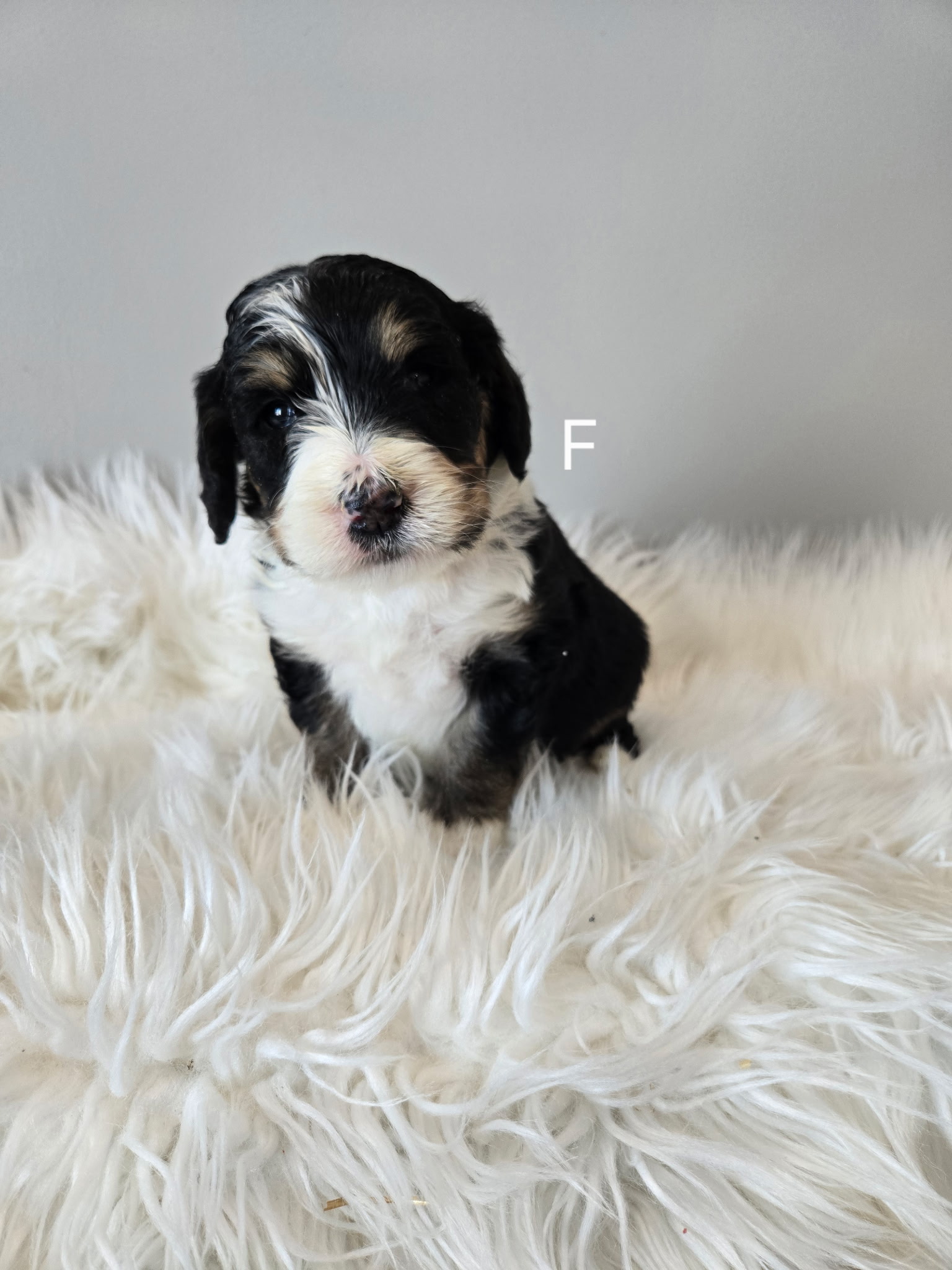 #20 Bobbett/Tahiti - Bernedoodle female, this cutie has a little bit less white on her face and an adorable speckled nose! $2000